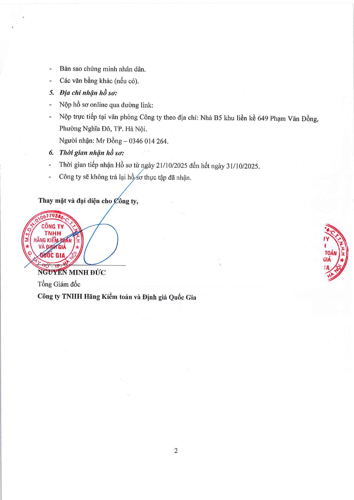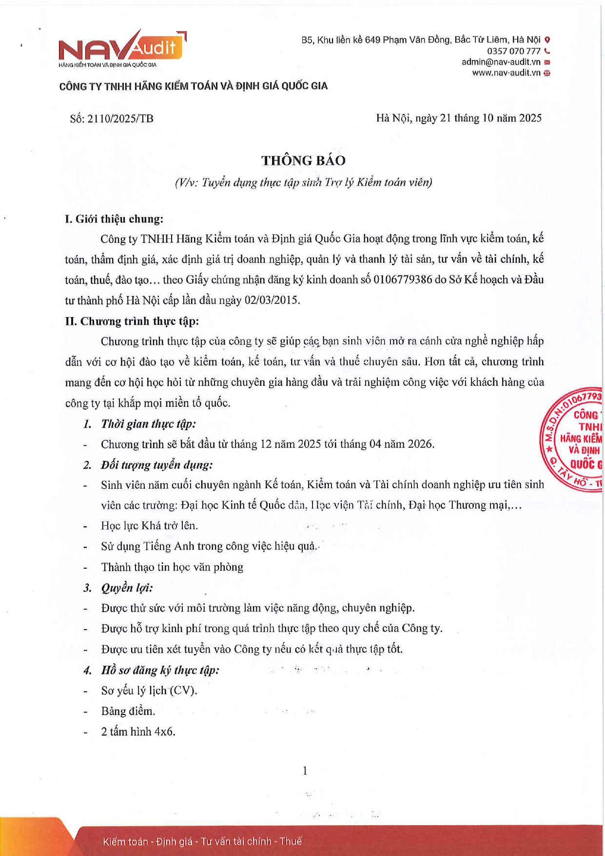 Công ty TNHH Hãng Kiểm toán và Định giá Quốc Gia (NAV) trân trọng thông báo chương trình tuyển dụng thực tập sinh Trợ lý Kiểm toán viên năm 2026 – cơ hội để các sinh viên năm cuối có niềm đam mê với nghề kiểm toán – kế toán – tài chính được trải nghiệm môi trường làm việc chuyên nghiệp và phát triển sự nghiệp trong tương lai.